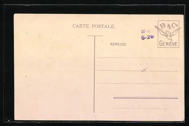 Personenbezogene Daten auf der Rückseite der Karte wurden durch blauen Textmarker unkenntlich gemacht. Die blauen Stellen sind auf die Vorderseite durchgeweicht und wirken sich negativ auf das Postkartenfoto aus