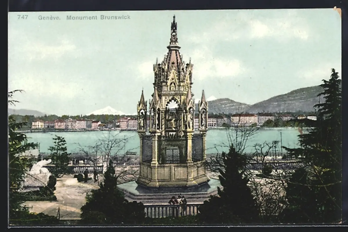AK Genève, Monument Brunswick und Uferpanorama aus der Vogelschau