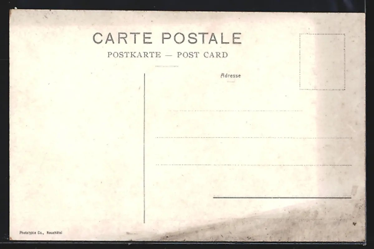 Personenbezogene Daten auf der Rückseite der Karte wurden durch blauen Textmarker unkenntlich gemacht. Die blauen Stellen sind auf die Vorderseite durchgeweicht und wirken sich negativ auf das Postkartenfoto aus