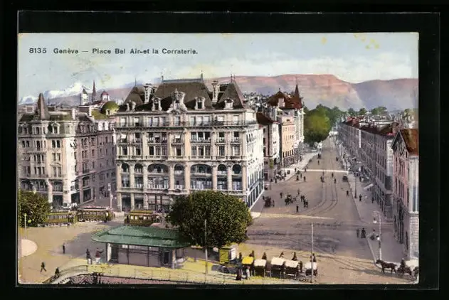 AK Genève, Place Bel Air et la Corraterie, Strassenbahn