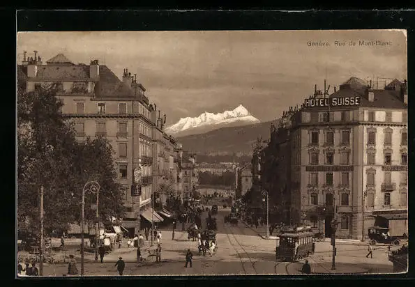 AK Genève, Rue du Mont-Blanc, Strassenbahn
