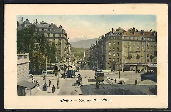 AK Genéve, Rue du Mont-Blanc, Strassenbahn