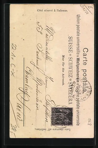 Personenbezogene Daten auf der Rückseite der Karte wurden durch blauen Textmarker unkenntlich gemacht. Die blauen Stellen sind auf die Vorderseite durchgeweicht und wirken sich negativ auf das Postkartenfoto aus