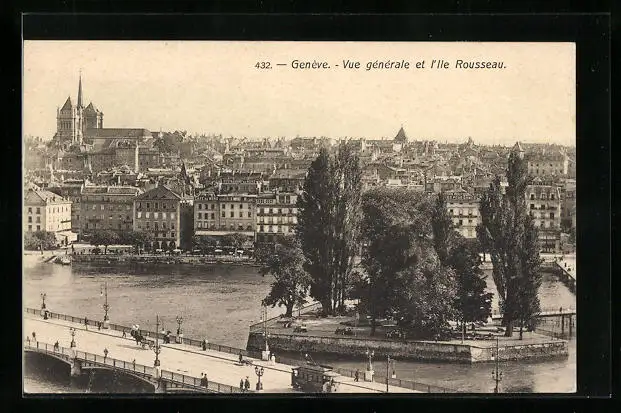 AK Genéve, Vue generale et l`lle Rousseau, Strassenbahn