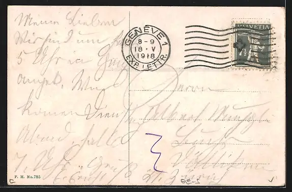 Personenbezogene Daten auf der Rückseite der Karte wurden durch blauen Textmarker unkenntlich gemacht. Die blauen Stellen sind auf die Vorderseite durchgeweicht und wirken sich negativ auf das Postkartenfoto aus