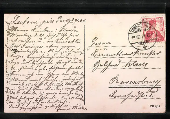 Personenbezogene Daten auf der Rückseite der Karte wurden durch blauen Textmarker unkenntlich gemacht. Die blauen Stellen sind auf die Vorderseite durchgeweicht und wirken sich negativ auf das Postkartenfoto aus