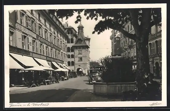 AK Genf, Strassenpartie mit Brunnen und Torturm, Verkaufsstände