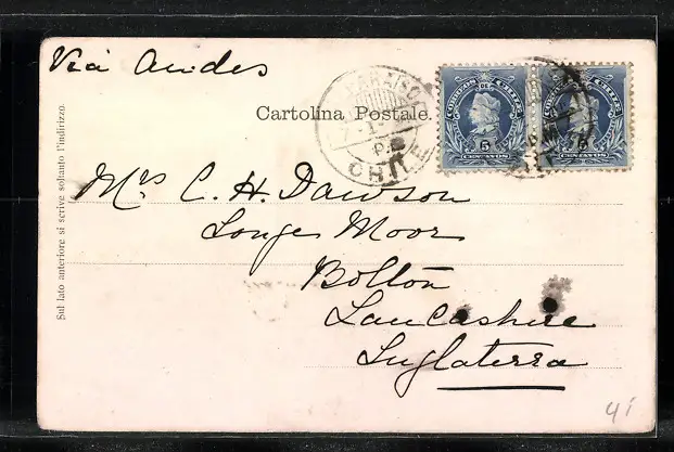Personenbezogene Daten auf der Rückseite der Karte wurden durch blauen Textmarker unkenntlich gemacht. Die blauen Stellen sind auf die Vorderseite durchgeweicht und wirken sich negativ auf das Postkartenfoto aus