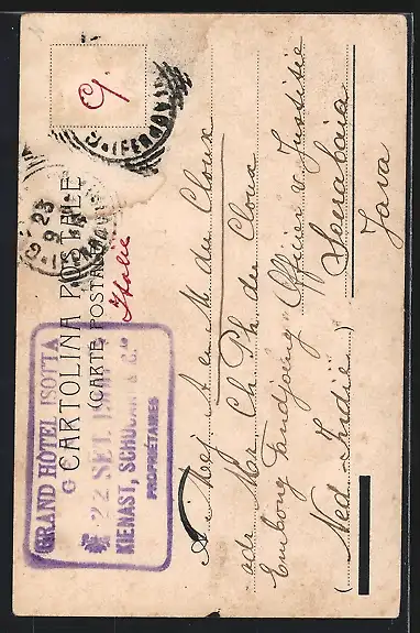 Personenbezogene Daten auf der Rückseite der Karte wurden durch blauen Textmarker unkenntlich gemacht. Die blauen Stellen sind auf die Vorderseite durchgeweicht und wirken sich negativ auf das Postkartenfoto aus