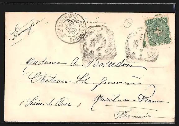 Personenbezogene Daten auf der Rückseite der Karte wurden durch blauen Textmarker unkenntlich gemacht. Die blauen Stellen sind auf die Vorderseite durchgeweicht und wirken sich negativ auf das Postkartenfoto aus