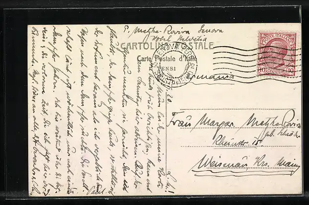 Personenbezogene Daten auf der Rückseite der Karte wurden durch blauen Textmarker unkenntlich gemacht. Die blauen Stellen sind auf die Vorderseite durchgeweicht und wirken sich negativ auf das Postkartenfoto aus