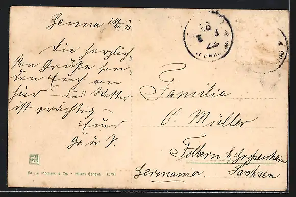 alte Ansichtskarte, gelaufen, Briefmarke entfernt, rückseitig Oberflächenschaden, guter Zustand