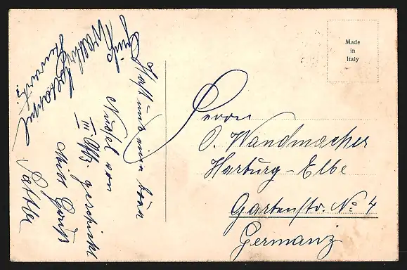 Personenbezogene Daten auf der Rückseite der Karte wurden durch blauen Textmarker unkenntlich gemacht. Die blauen Stellen sind auf die Vorderseite durchgeweicht und wirken sich negativ auf das Postkartenfoto aus