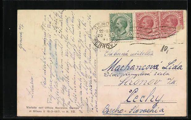 Personenbezogene Daten auf der Rückseite der Karte wurden durch blauen Textmarker unkenntlich gemacht. Die blauen Stellen sind auf die Vorderseite durchgeweicht und wirken sich negativ auf das Postkartenfoto aus
