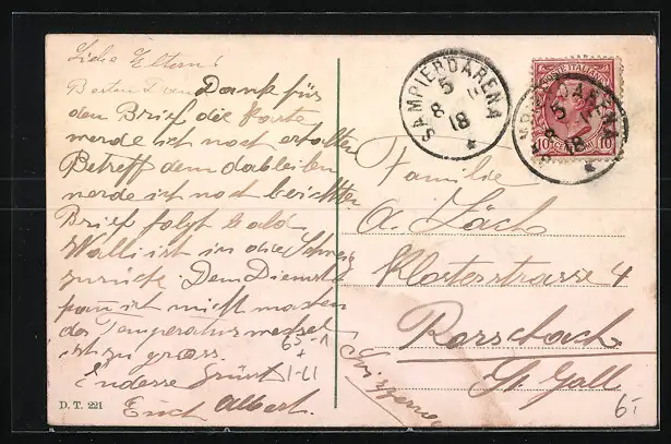 Personenbezogene Daten auf der Rückseite der Karte wurden durch blauen Textmarker unkenntlich gemacht. Die blauen Stellen sind auf die Vorderseite durchgeweicht und wirken sich negativ auf das Postkartenfoto aus