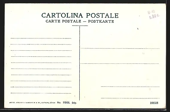 Personenbezogene Daten auf der Rückseite der Karte wurden durch blauen Textmarker unkenntlich gemacht. Die blauen Stellen sind auf die Vorderseite durchgeweicht und wirken sich negativ auf das Postkartenfoto aus