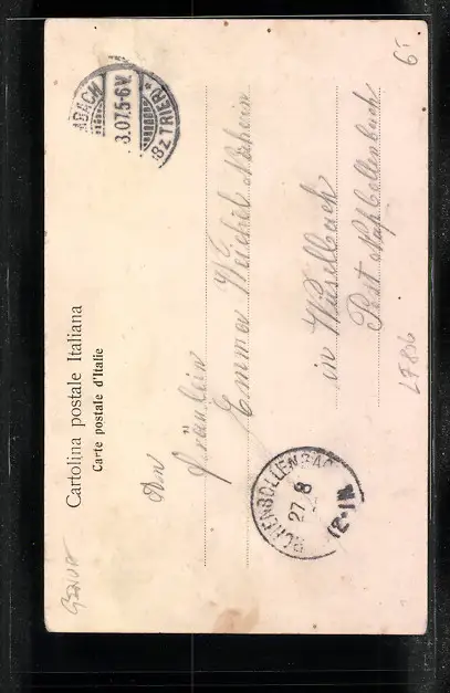 Personenbezogene Daten auf der Rückseite der Karte wurden durch blauen Textmarker unkenntlich gemacht. Die blauen Stellen sind auf die Vorderseite durchgeweicht und wirken sich negativ auf das Postkartenfoto aus