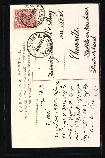 Personenbezogene Daten auf der Rückseite der Karte wurden durch blauen Textmarker unkenntlich gemacht. Die blauen Stellen sind auf die Vorderseite durchgeweicht und wirken sich negativ auf das Postkartenfoto aus