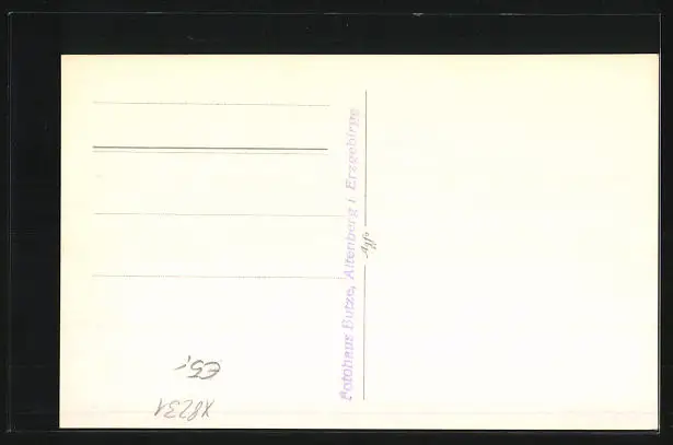 Personenbezogene Daten auf der Rückseite der Karte wurden durch blauen Textmarker unkenntlich gemacht. Die blauen Stellen sind auf die Vorderseite durchgeweicht und wirken sich negativ auf das Postkartenfoto aus