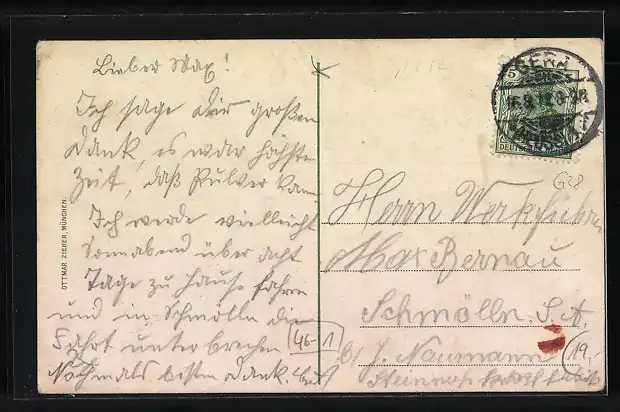 Personenbezogene Daten auf der Rückseite der Karte wurden durch blauen Textmarker unkenntlich gemacht. Die blauen Stellen sind auf die Vorderseite durchgeweicht und wirken sich negativ auf das Postkartenfoto aus
