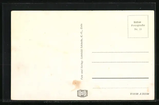 Personenbezogene Daten auf der Rückseite der Karte wurden durch blauen Textmarker unkenntlich gemacht. Die blauen Stellen sind auf die Vorderseite durchgeweicht und wirken sich negativ auf das Postkartenfoto aus