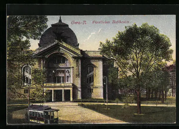 AK Gera-R., Fürstliches Hoftheater mit Strassenbahn