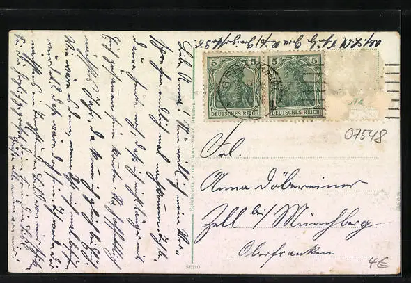 Personenbezogene Daten auf der Rückseite der Karte wurden durch blauen Textmarker unkenntlich gemacht. Die blauen Stellen sind auf die Vorderseite durchgeweicht und wirken sich negativ auf das Postkartenfoto aus
