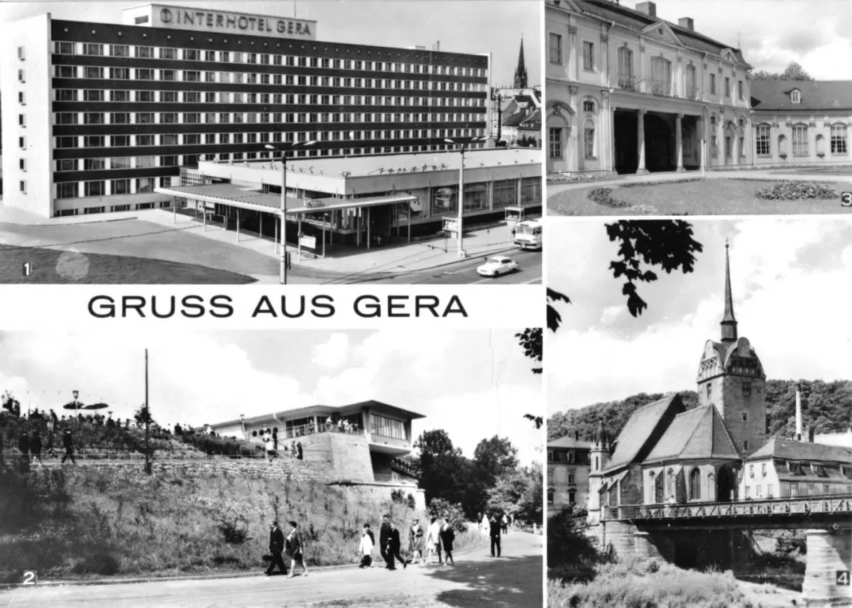Ansichtskarte Gera vier Abb. - Interhotel Gera, Terassencafé "Osterstein", Museum im Park der OdF, An der Weißen Elster Erhaltung I-II, minimal bügig ungelaufen Druckvermerk: 1978 Herstellungsland: DDR Verlag: Bild und Heimat, Reichenbach i. V. - 01 10 31 062