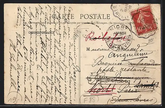 Personenbezogene Daten auf der Rückseite der Karte wurden durch blauen Textmarker unkenntlich gemacht. Die blauen Stellen sind auf die Vorderseite durchgeweicht und wirken sich negativ auf das Postkartenfoto aus