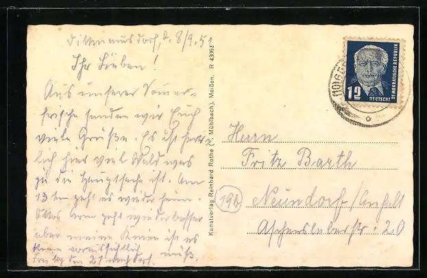 Personenbezogene Daten auf der Rückseite der Karte wurden durch blauen Textmarker unkenntlich gemacht. Die blauen Stellen sind auf die Vorderseite durchgeweicht und wirken sich negativ auf das Postkartenfoto aus