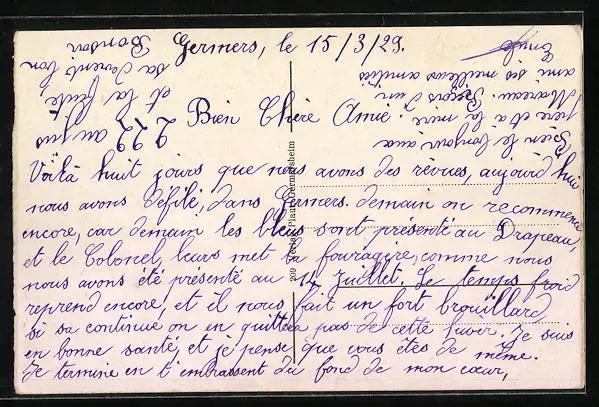 Personenbezogene Daten auf der Rückseite der Karte wurden durch blauen Textmarker unkenntlich gemacht. Die blauen Stellen sind auf die Vorderseite durchgeweicht und wirken sich negativ auf das Postkartenfoto aus