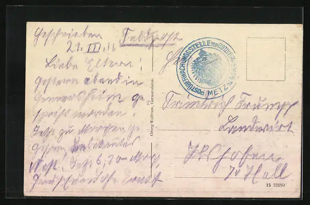 Personenbezogene Daten auf der Rückseite der Karte wurden durch blauen Textmarker unkenntlich gemacht. Die blauen Stellen sind auf die Vorderseite durchgeweicht und wirken sich negativ auf das Postkartenfoto aus