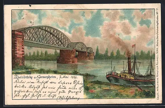 AK Germersheim, Rheinbrücke, Boot am Ufer