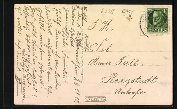 Personenbezogene Daten auf der Rückseite der Karte wurden durch blauen Textmarker unkenntlich gemacht. Die blauen Stellen sind auf die Vorderseite durchgeweicht und wirken sich negativ auf das Postkartenfoto aus