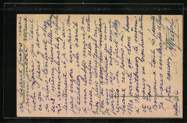 Personenbezogene Daten auf der Rückseite der Karte wurden durch blauen Textmarker unkenntlich gemacht. Die blauen Stellen sind auf die Vorderseite durchgeweicht und wirken sich negativ auf das Postkartenfoto aus