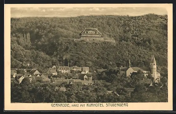 AK Gernrode /Harz, Ortsansicht mit Kirche und Kurhotel Stubenberg