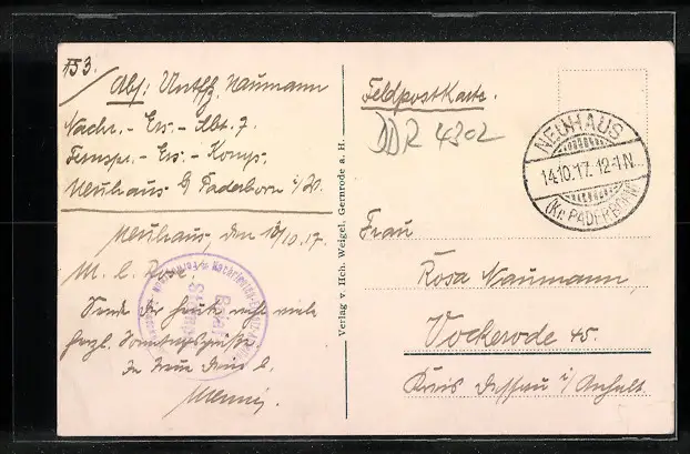 Personenbezogene Daten auf der Rückseite der Karte wurden durch blauen Textmarker unkenntlich gemacht. Die blauen Stellen sind auf die Vorderseite durchgeweicht und wirken sich negativ auf das Postkartenfoto aus