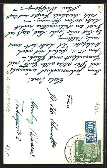 Personenbezogene Daten auf der Rückseite der Karte wurden durch blauen Textmarker unkenntlich gemacht. Die blauen Stellen sind auf die Vorderseite durchgeweicht und wirken sich negativ auf das Postkartenfoto aus