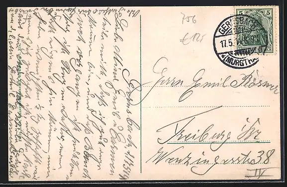 Personenbezogene Daten auf der Rückseite der Karte wurden durch blauen Textmarker unkenntlich gemacht. Die blauen Stellen sind auf die Vorderseite durchgeweicht und wirken sich negativ auf das Postkartenfoto aus