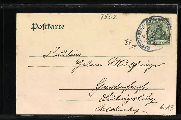 Personenbezogene Daten auf der Rückseite der Karte wurden durch blauen Textmarker unkenntlich gemacht. Die blauen Stellen sind auf die Vorderseite durchgeweicht und wirken sich negativ auf das Postkartenfoto aus