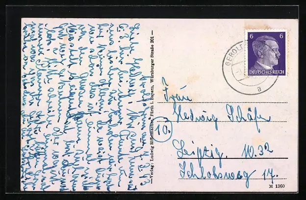 Personenbezogene Daten auf der Rückseite der Karte wurden durch blauen Textmarker unkenntlich gemacht. Die blauen Stellen sind auf die Vorderseite durchgeweicht und wirken sich negativ auf das Postkartenfoto aus