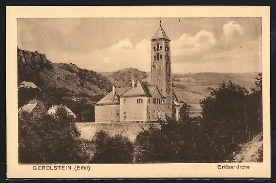 AK Gerolstein /Eifel, Die Erlöserkirche in der Hügellandschaft