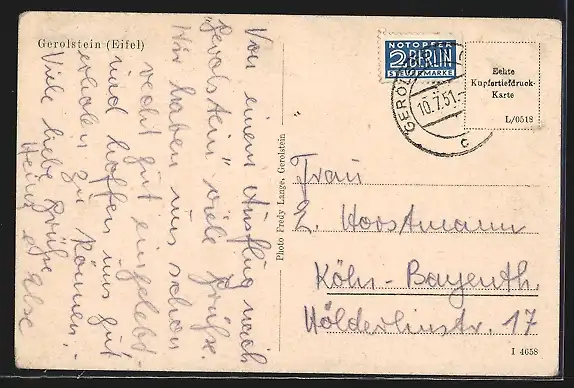 alte Ansichtskarte, gelaufen 1951, Briefmarke entfernt, guter Zustand