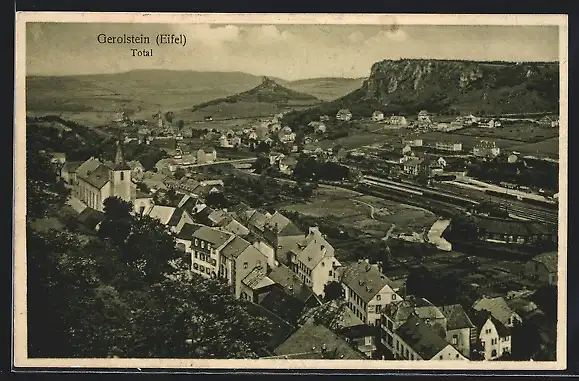 AK Gerolstein /Eifel, Ortsansicht mit Kirche und umliegendem Felsmassiv