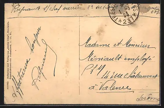 Personenbezogene Daten auf der Rückseite der Karte wurden durch blauen Textmarker unkenntlich gemacht. Die blauen Stellen sind auf die Vorderseite durchgeweicht und wirken sich negativ auf das Postkartenfoto aus