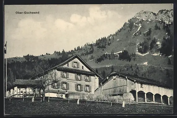 AK Gersau, Ober-Gschwend, Almhof mit Familie und Scheune