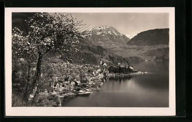 AK Gersau, Uferpartie bei Baumblüte