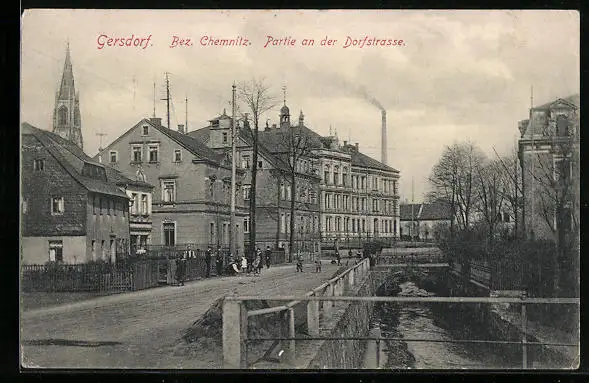 AK Gersdorf /Bez. Chemnitz, Partie an der Dorfstrasse mit Kirche