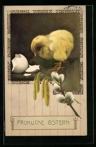 AK Geschlüpftes Osterküken, Palmkätzchenzweig