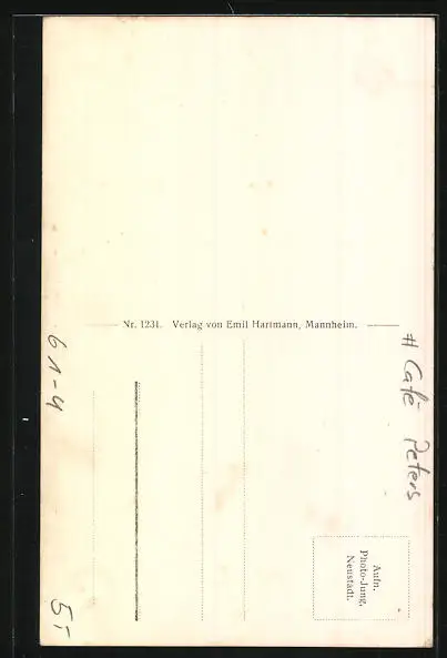 Personenbezogene Daten auf der Rückseite der Karte wurden durch blauen Textmarker unkenntlich gemacht. Die blauen Stellen sind auf die Vorderseite durchgeweicht und wirken sich negativ auf das Postkartenfoto aus